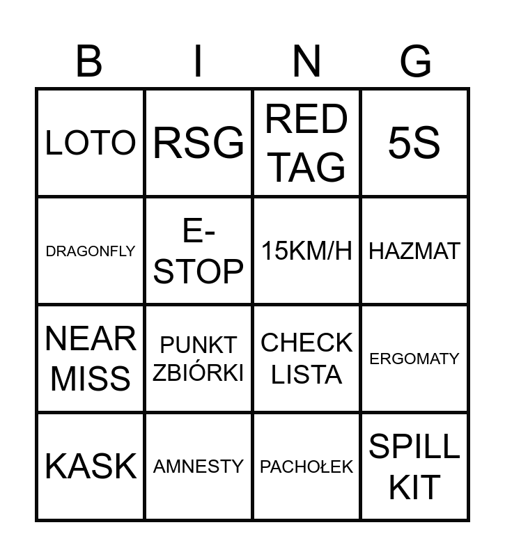 This bingo card has 16 words: AMNESTY, ERGOMATY, RED TAG, LOTO, NEAR MISS, RSG, CHECK LISTA, PACHOŁEK, DRAGONFLY, E-STOP, KASK, 5S, PUNKT ZBIÓRKI, HAZMAT, 15KM/H and SPILL KIT.