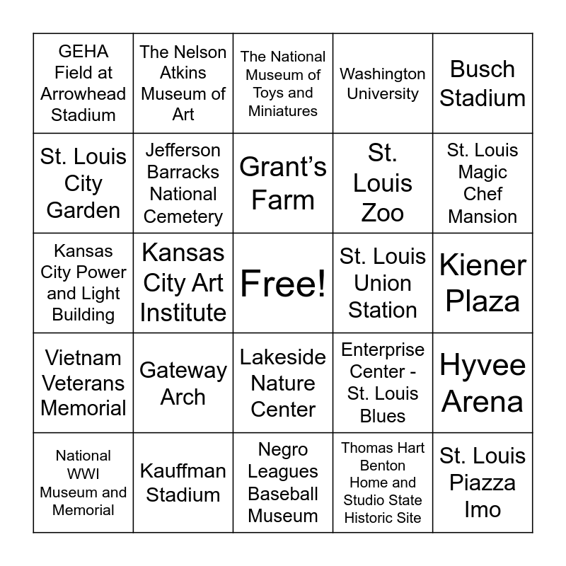 This bingo card has a free space and 24 words: Gateway Arch, Kauffman Stadium, Grant’s Farm, National WWI Museum and Memorial, Busch Stadium, GEHA Field at Arrowhead Stadium, St. Louis City Garden, The Nelson Atkins Museum of Art, St. Louis Union Station, Lakeside Nature Center, St. Louis Zoo, Kansas City Power and Light Building, Enterprise Center - St. Louis Blues, Hyvee Arena, Jefferson Barracks National Cemetery, Thomas Hart Benton Home and Studio State Historic Site, Kiener Plaza, The National Museum of Toys and Miniatures, St. Louis Magic Chef Mansion, Kansas City Art Institute, St. Louis Piazza Imo, Vietnam Veterans Memorial, Washington University and Negro Leagues Baseball Museum.