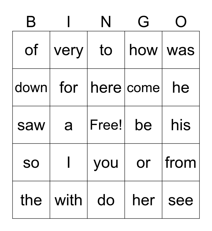 This bingo card has a free space and 29 words: the, is, a, and, of, to, for, I, be, with, his, see, do, her, he, put, you, so, was, saw, or, what, come, down, how, very, from, here and when.