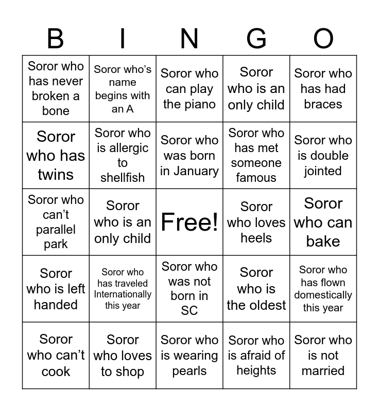 This bingo card has a free space and 24 words: Soror who has traveled Internationally this year, Soror who loves to shop, Soror who was born in January, Soror who can’t cook, Soror who has had braces, Soror who has never broken a bone, Soror who has twins, Soror who’s name begins with an A, Soror who loves heels, Soror who was not born in SC, Soror who has met someone famous, Soror who can’t parallel park, Soror who is the oldest, Soror who has flown domestically this year, Soror who is allergic to shellfish, Soror who is afraid of heights, Soror who can bake, Soror who can play the piano, Soror who is double jointed, Soror who is an only child, Soror who is not married, Soror who is left handed, Soror who is an only child and Soror who is wearing pearls.