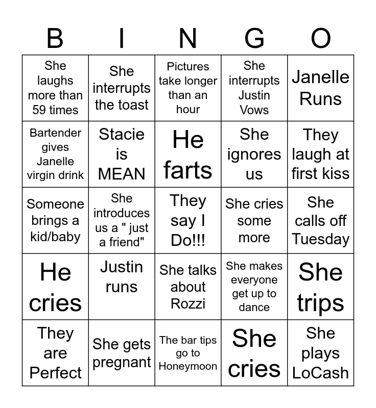 This bingo card has a free space and 24 words: Justin runs, She gets pregnant, He farts, They are Perfect, Janelle Runs, She laughs more than 59 times, Bartender gives Janelle virgin drink, She interrupts the toast, She cries some more, She talks about Rozzi, She ignores us, Someone brings a kid/baby, She makes everyone get up to dance, She trips, Stacie is MEAN, She cries, She calls off Tuesday, Pictures take longer than an hour, They laugh at first kiss, She introduces us a " just a friend", She plays LoCash, He cries, She interrupts Justin Vows and The bar tips go to Honeymoon.