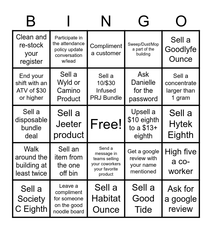 This bingo card has a free space and 24 words: Sell an item from the one off bin, Leave a compliment for someone on the good noodle board, Sell a 10/$30 Infused PRJ Bundle, Sell a Society C Eighth, Sell a Goodlyfe Ounce, Clean and re-stock your register, End your shift with an ATV of $30 or higher, Participate in the attendance policy update conversation w/lead, Upsell a $10 eighth to a $13+ eighth, Send a message in teams selling your coworkers your favorite product, Ask Danielle for the password, Sell a disposable bundle deal, Get a google review with your name mentioned, High five a co-worker, Sell a Wyld or Camino Product, Sell a Good Tide, Sell a Hytek Eighth, Compliment a customer, Sell a concentrate larger than 1 gram, Sell a Jeeter product, Ask for a google review, Walk around the building at least twice, Sweep/Dust/Mop a part of the building and Sell a Habitat Ounce.