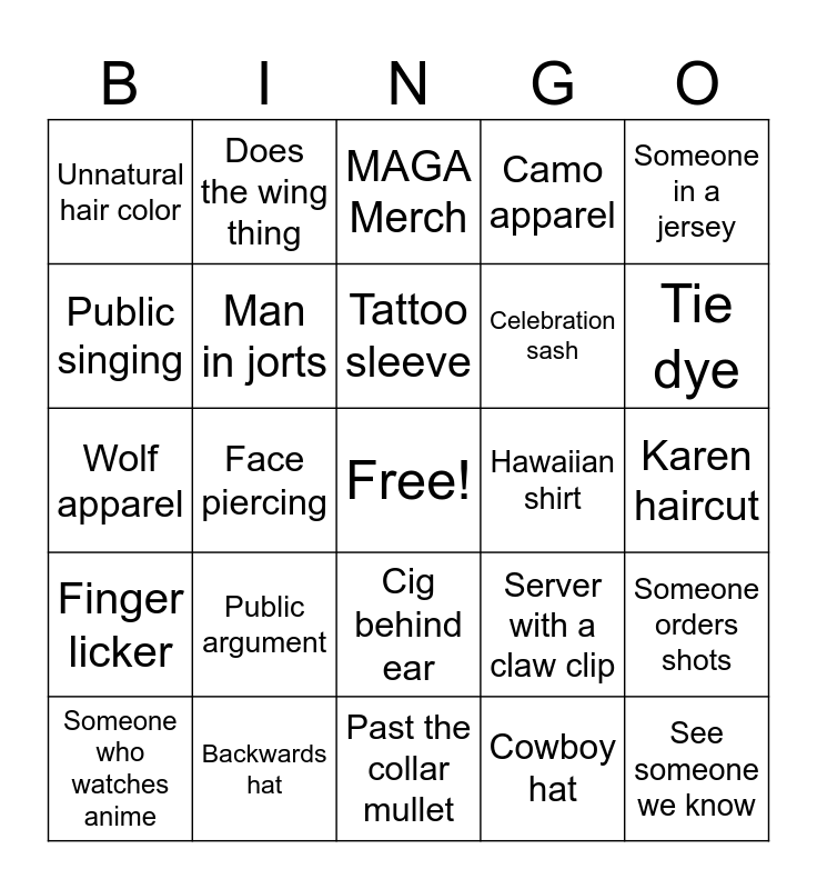 This bingo card has a free space and 31 words: Past the collar mullet, Past the collar beard, Face piercing, Sunglasses indoors, Unnatural hair color, MAGA Merch, Man in jorts, Server with a claw clip, Hawaiian shirt, Cowboy hat, Karen haircut, See someone we know, Get carded, Booth, Tie dye, And1 shorts, Someone orders shots, Public argument, Finger licker, Cig behind ear, Someone in a jersey, Cut off sleeves, Someone who watches anime, Does the wing thing, Celebration sash, Public singing, Camo apparel, Wolf apparel, Backwards hat, Tattoo sleeve and Hitting vape indoors.