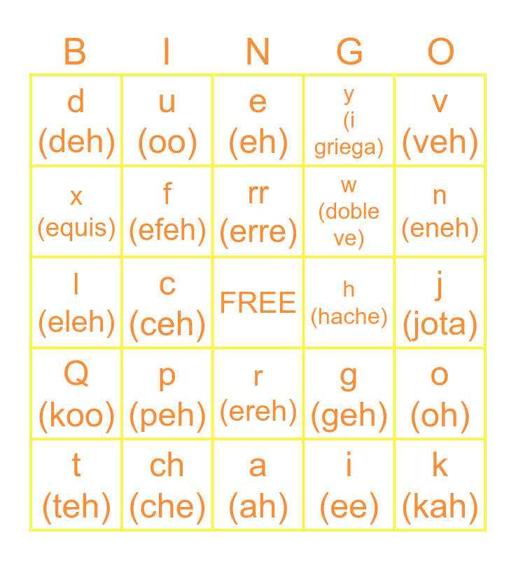 This bingo card has a free space and 31 words: a (ah), b (beh), c (ceh), x (eh-keys), d (deh), e (eh), f (efeh), g (geh), h (hache), i (ee), j (jota), k (kah), z (zeta), m (emeh), n (eneh), ñ (eñyeh), o (oh), p (peh), Q (koo), r (ereh), v (veh), s (eseh), t (teh), u (oo), w (doble ve), x (equis), y (i griega), l (eleh), ch (che), rr (erre) and ll (eyeh.