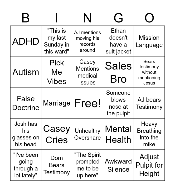 This bingo card has a free space and 24 words: Casey Cries, Dom Bears Testimony, Casey Mentions medical issues, "I've been going through a lot lately", Mission Language, ADHD, Autism, "This is my last Sunday in this ward", Someone blows nose at the pulpit, Unhealthy Overshare, Sales Bro, False Doctrine, Mental Health, Heavy Breathing into the mike, Pick Me Vibes, Awkward Silence, AJ bears Testimony, AJ mentions moving his records around, Bears testimony without mentioning Jesus, Marriage, Adjust Pulpit for Height, Josh has his glasses on his head, Ethan doesn't have a suit jacket and "The Spirit prompted me to be up here".