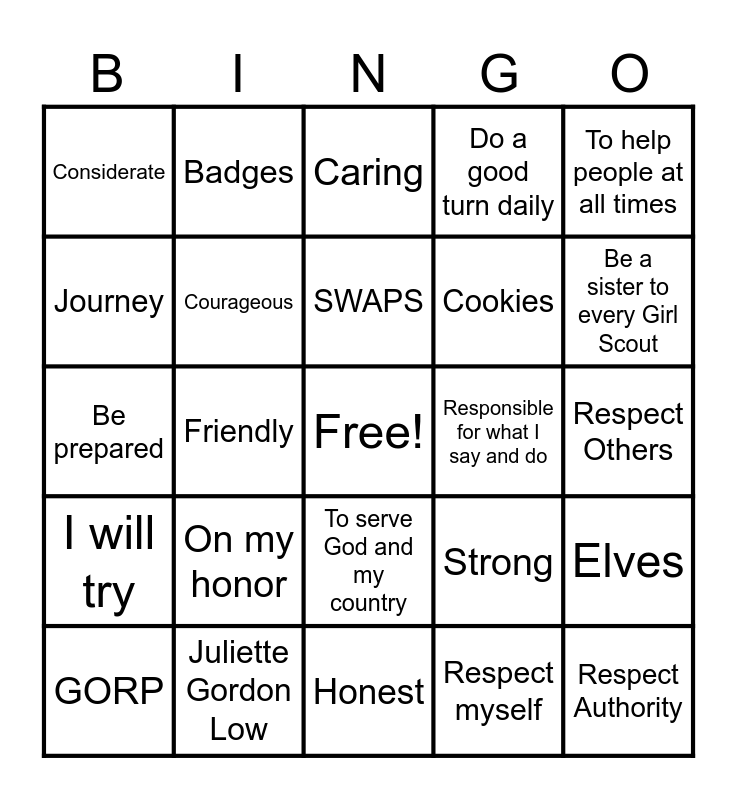 This bingo card has a free space and 31 words: Honest, Fair, Friendly, Helpful, Considerate, Caring, Courageous, Strong, Responsible for what I say and do, Respect myself, Respect Others, Respect Authority, Use Resources wisely, Make the world a better place, Be a sister to every Girl Scout, Trefoil, Elves, On my honor, I will try, To serve God and my country, To help people at all times, To live by the Girl Scout Law, GORP, Badges, Cookies, Journey, Do a good turn daily, Be prepared, Juliette Gordon Low, SWAPS and Brownie.