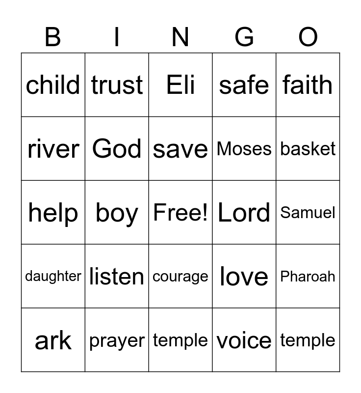 This bingo card has a free space and 29 words: ark, bed, boy, call, child, Eli, God, listen, Lord, prayer, Samuel, temple, temple, voice, basket, baby, courage, daughter, faith, help, love, Miriam, Moses, river, safe, trust, Pharoah, save and Bible.