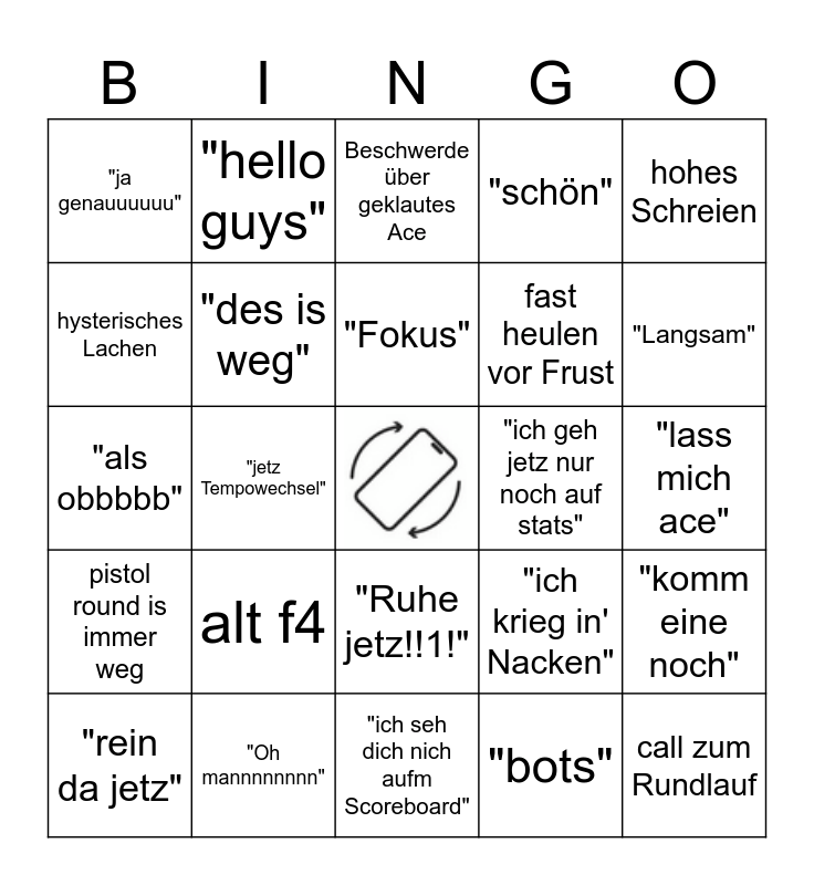 This bingo card has a free space and 24 words: alt f4, "Oh mannnnnnnn", "Fokus", "rein da jetz", hohes Schreien, "ja genauuuuuu", hysterisches Lachen, "hello guys", "ich geh jetz nur noch auf stats", "Ruhe jetz!!1!", fast heulen vor Frust, "als obbbbb", "ich krieg in' Nacken", "komm eine noch", "des is weg", "bots", "lass mich ace", Beschwerde über geklautes Ace, "Langsam", "jetz Tempowechsel", call zum Rundlauf, pistol round is immer weg, "schön" and "ich seh dich nich aufm Scoreboard".