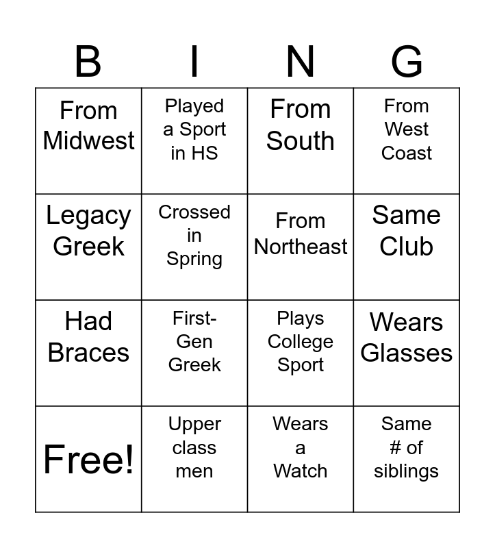 This bingo card has 23 words: Same # of siblings, Summer Birthday, Same Club, Has a Dog, Legacy Greek, From Midwest, Crossed in Spring, Played a Sport in HS, Free!, Same Favorite Color, First-Gen Greek, Had Braces, Under class men, From East Coast, Upper class men, Wears Earrings, From South, Plays College Sport, From Northeast, Wears Glasses, From West Coast, Wears a Watch and Crossed in Fall.