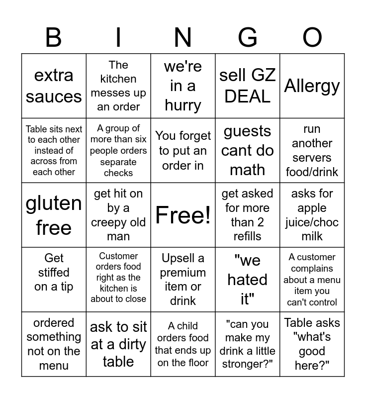 This bingo card has a free space and 24 words: Customer orders food right as the kitchen is about to close, ask to sit at a dirty table, You forget to put an order in, ordered something not on the menu, Allergy, extra sauces, Table sits next to each other instead of across from each other, The kitchen messes up an order, get asked for more than 2 refills, Upsell a premium item or drink, guests cant do math, gluten free, "we hated it", A customer complains about a menu item you can't control, A group of more than six people orders separate checks, "can you make my drink a little stronger?", asks for apple juice/choc milk, we're in a hurry, run another servers food/drink, get hit on by a creepy old man, Table asks "what's good here?", Get stiffed on a tip, sell GZ DEAL and A child orders food that ends up on the floor.