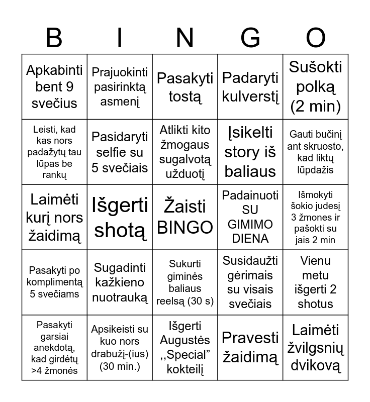 This bingo card has a free space and 29 words: Pasakyti garsiai anekdotą, kad girdėtų >4 žmonės, Pabendrauti su visais svečiais, Išgerti shotą, Pašokti romantinį šokį su pasirinktu žmogum, Apkabinti bent 9 svečius, Pasakyti tostą, Pasidaryti selfie su 5 svečiais, Sugadinti kažkieno nuotrauką, Padainuoti SU GIMIMO DIENA, Apsikeisti su kuo nors drabužį-(ius) (30 min.), Išmokyti šokio judesį 3 žmones ir pašokti su jais 2 min, Laimėti žvilgsnių dvikovą, Išgerti Augustės ,,Special” kokteilį, Pravesti žaidimą, Gauti bučinį ant skruosto, kad liktų lūpdažis, Atsakyti į kieno nors užduotą spicy klausimą girdint bent 5 žmonėms, Sukurti giminės baliaus reelsą (30 s), Pasakyti po komplimentą 5 svečiams, Sušokti polką (2 min), Laimėti kurį nors žaidimą, Susidaužti gėrimais su visais svečiais, Išgerti shotą nenaudojant rankų, Įsikelti story iš baliaus, Leisti, kad kas nors padažytų tau lūpas be rankų, Padaryti kulverstį, Prajuokinti pasirinktą asmenį, Vienu metu išgerti 2 shotus, Atlikti kito žmogaus sugalvotą užduotį and Pasirinkti tiesą arba drąsą ir ją įvykdyti.