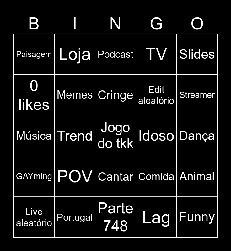 This bingo card has a free space and 24 words: POV, Portugal, Cringe, Live aleatório, Slides, Paisagem, 0 likes, Loja, Idoso, Cantar, Edit aleatório, Música, Comida, Animal, Memes, Lag, Dança, Podcast, Streamer, Trend, Funny, GAYming, TV and Parte 748.