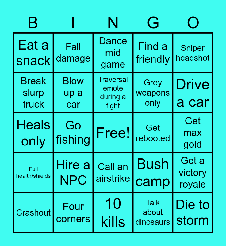 This bingo card has a free space and 24 words: Hire a NPC, Four corners, Traversal emote during a fight, Crashout, Sniper headshot, Eat a snack, Break slurp truck, Fall damage, Get rebooted, Call an airstrike, Grey weapons only, Heals only, Bush camp, Get a victory royale, Blow up a car, Talk about dinosaurs, Get max gold, Dance mid game, Drive a car, Go fishing, Die to storm, Full health/shields, Find a friendly and 10 kills.