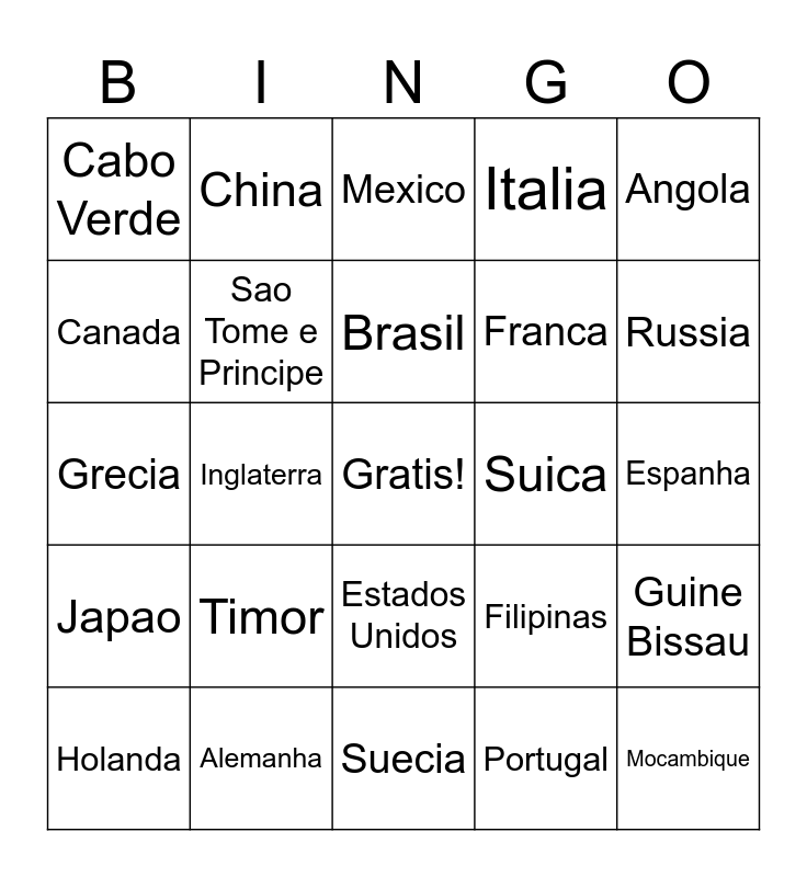 This bingo card has a free space and 26 words: Estados Unidos, Portugal, Brasil, Alemanha, Angola, Cabo Verde, Canada, China, Espanha, Filipinas, Franca, Grecia, Guine Bissau, Holanda, Inglaterra, Irlanda, Italia, Japao, Mexico, Mocambique, Russia, Suecia, Suica, Timor, Sao Tome e Principe and Acores.