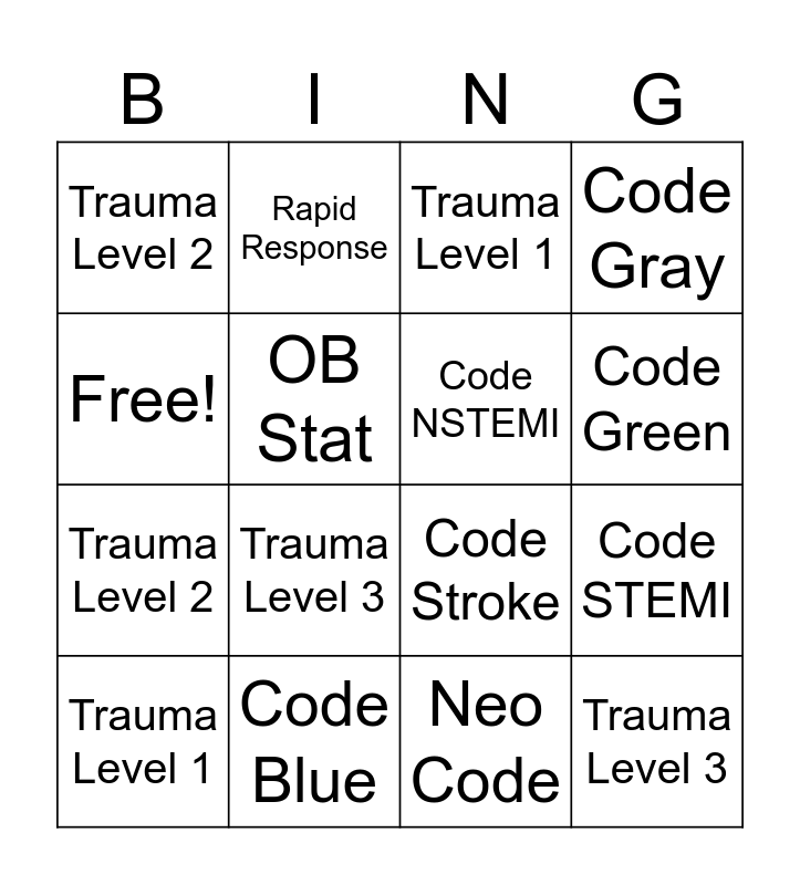 This bingo card has 16 words: Code Blue, Code STEMI, Trauma Level 1, Trauma Level 2, Trauma Level 2, Rapid Response, Code Stroke, Neo Code, Free!, OB Stat, Trauma Level 1, Code Gray, Trauma Level 3, Code Green, Code NSTEMI and Trauma Level 3.