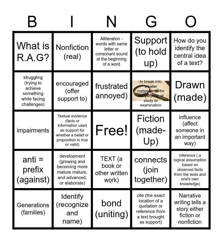 This bingo card has 1 images, a free space and 24 words: development (growing and becoming more mature mature, and advanced, or elaborate), Identify (recognize and name), frustrated annoyed), Generations (families), How do you identify the central idea of a text?, What is R.A.G?, struggling (trying to achieve something while facing challenges), Nonfiction (real), Fiction (made-Up), TEXT (a book or other written work), to break into smaller components for the purpose of study or examination, impairments, connects (join together), inference ( a logical assumption based on observed facts from the texts and one's own knowledge), encouraged (offer support to), cite (the exact location of a quotation or reference from a text brought as support), influence (affect someone in an important way), Alliteration - words with same letter or consonant sound at the beginning of a word, Drawn (made), Textual evidence (facts or information used as support for whether a belief or proposition is true or valid), Narrative writing tells a story either fiction or nonfiction, anti = prefix (against), Support (to hold up) and bond (uniting).