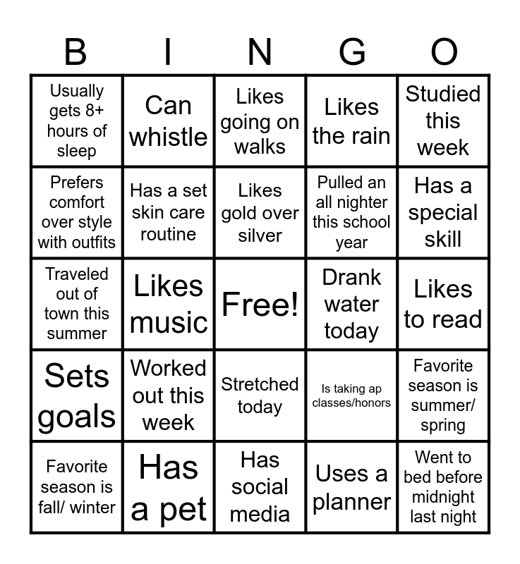 This bingo card has a free space and 30 words: Has a pet, Prefers tea over coffee, Likes music, Eats breakfast, Usually gets 8+ hours of sleep, Likes going on walks, Has a set skin care routine, Stretched today, Drank water today, Has social media, Likes to read, Went to bed before midnight last night, Uses a planner, Likes to draw, Has a special skill, Has siblings, Is taking ap classes/honors, Sets goals, Worked out this week, Studied this week, Traveled out of town this summer, Hates pineapple on pizza, Can whistle, Pulled an all nighter this school year, Prefers comfort over style with outfits, Likes the rain, Favorite season is summer/ spring, Favorite season is fall/ winter, Likes gold over silver and Favorite fast food place is CFA.