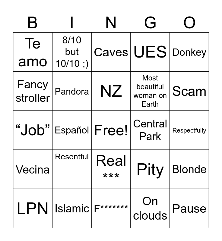 This bingo card has a free space and 24 words: Resentful, Islamic, NZ, LPN, Donkey, Te amo, Fancy stroller, 8/10 but 10/10 ;), Central Park, Real ***, Most beautiful woman on Earth, “Job”, Pity, Blonde, Pandora, On clouds, Respectfully, Caves, Scam, Español, Pause, Vecina, UES and F*******.