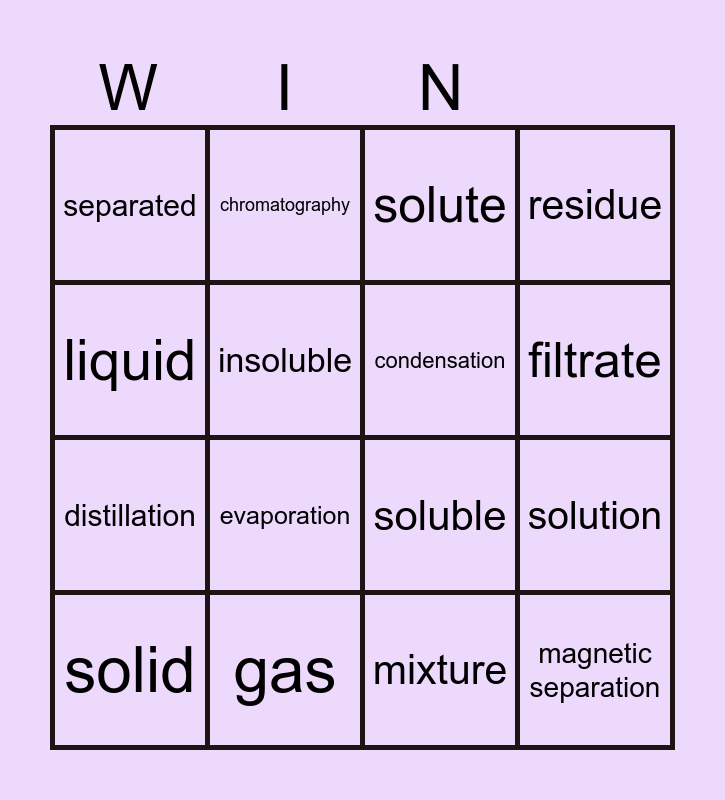 This bingo card has 20 words: solution, solvent, solute, filtration, solid, liquid, gas, separated, distillation, chromatography, evaporation, soluble, insoluble, magnetic separation, condensation, filter paper, filtrate, residue, mixture and bunsen burner.