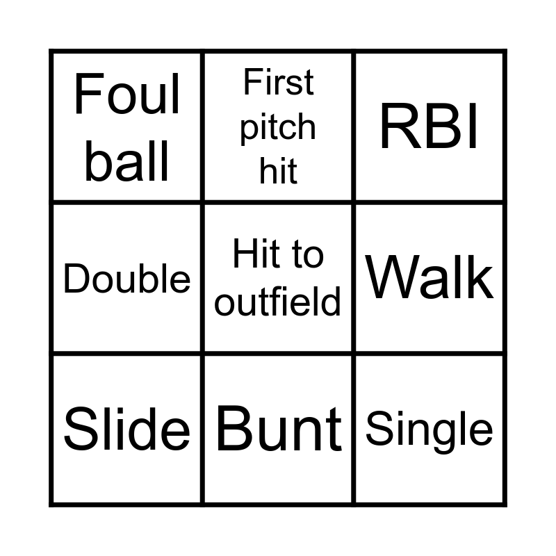 This bingo card has 12 words: Free!, Single, Hit to outfield, Walk, First pitch hit, RBI, Bunt, Hit by a pitch, Foul ball, Double, Slide and Scored a run.