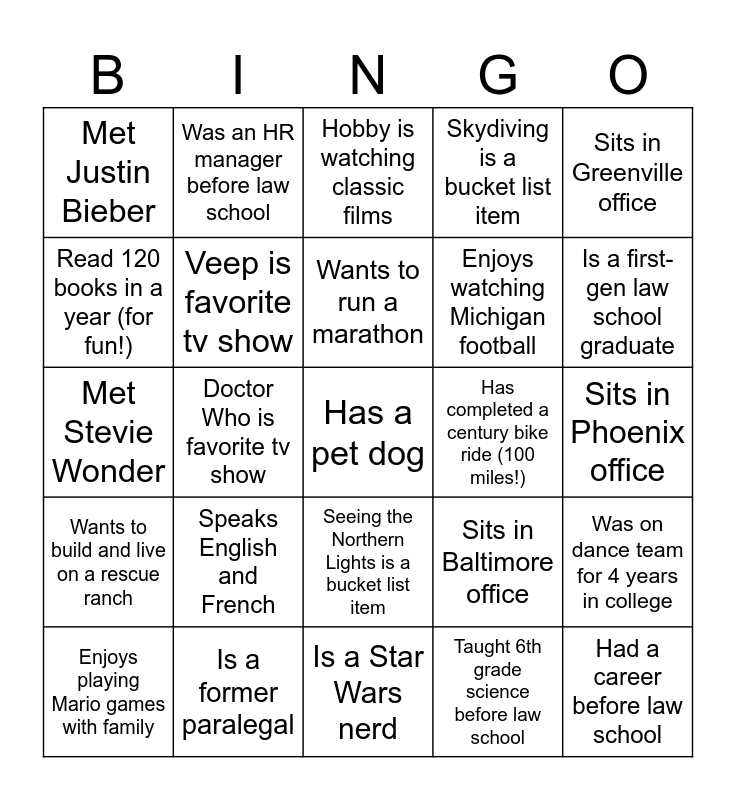 This bingo card has 28 words: Was on dance team for 4 years in college, Wants to travel to Antartica, Enjoys watching Michigan football, Taught 6th grade science before law school, Read 120 books in a year (for fun!), Hobby is watching classic films, Was an HR manager before law school, Wants to build and live on a rescue ranch, Has completed a century bike ride (100 miles!), Enjoys playing Mario games with family, Met Stevie Wonder, Skydiving is a bucket list item, Is a former paralegal, Is a Star Wars nerd, Is a first-gen law school graduate, Proudest accomplishment is graduating law school, Speaks English and French, Veep is favorite tv show, Wants to run a marathon, Seeing the Northern Lights is a bucket list item, Met Justin Bieber, Had a career before law school, Has a pet dog, Doctor Who is favorite tv show, Sits in Phoenix office, Sits in Baltimore office, Sits in Greenville office and Sits in any CA office.