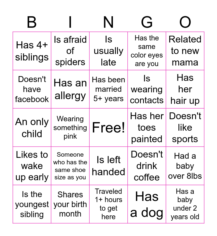 This bingo card has a free space and 24 words: Someone who has the same shoe size as you, Shares your birth month, Has been married 5+ years, Is the youngest sibling, Related to new mama, Has 4+ siblings, Doesn't have facebook, Is afraid of spiders, Has her toes painted, Is left handed, Is wearing contacts, An only child, Doesn't drink coffee, Had a baby over 8lbs, Has an allergy, Has a dog, Doesn't like sports, Is usually late, Has her hair up, Wearing something pink, Has a baby under 2 years old, Likes to wake up early, Has the same color eyes are you and Traveled 1+ hours to get here.