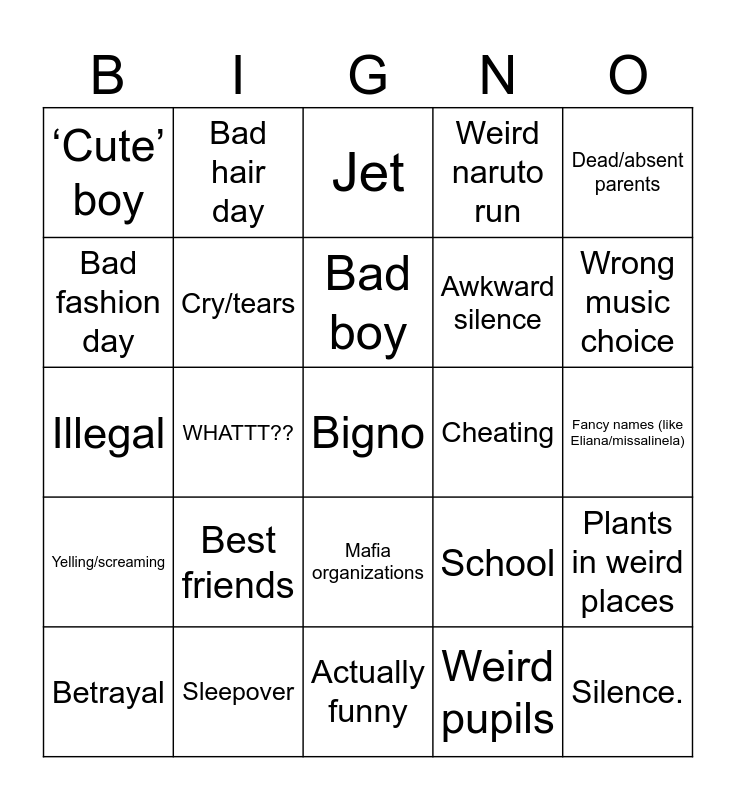 This bingo card has a free space and 24 words: Best friends, Sleepover, Bad boy, Betrayal, Dead/absent parents, ‘Cute’ boy, Bad fashion day, Bad hair day, Cheating, Mafia organizations, Awkward silence, Illegal, School, Plants in weird places, Cry/tears, Weird pupils, Fancy names (like Eliana/missalinela), Jet, Wrong music choice, WHATTT??, Silence., Yelling/screaming, Weird naruto run and Actually funny.
