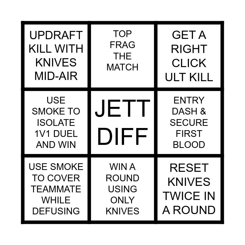 This bingo card has a free space and 8 words: ENTRY DASH & SECURE FIRST BLOOD, GET A RIGHT CLICK ULT KILL, TOP FRAG THE MATCH, USE SMOKE TO COVER TEAMMATE WHILE DEFUSING, UPDRAFT KILL WITH KNIVES MID-AIR, RESET KNIVES TWICE IN A ROUND, USE SMOKE TO ISOLATE 1V1 DUEL AND WIN and WIN A ROUND USING ONLY KNIVES.