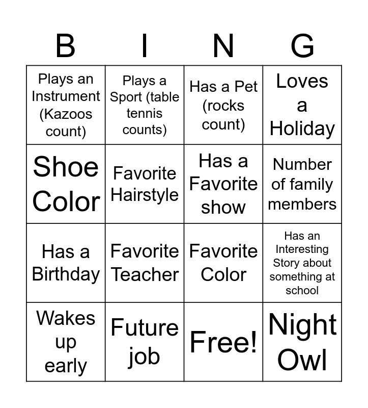 This bingo card has 17 words: Free!, Wakes up early, Has a Pet (rocks count), Plays an Instrument (Kazoos count), Favorite Teacher, Loves a Holiday, Has an Interesting Story about something at school, Has a Favorite show, Number of family members, Favorite Hairstyle, Future job, Favorite Color, Shoe Color, Plays a Sport (table tennis counts), Has a Birthday, Favorite jewelry and Night Owl.