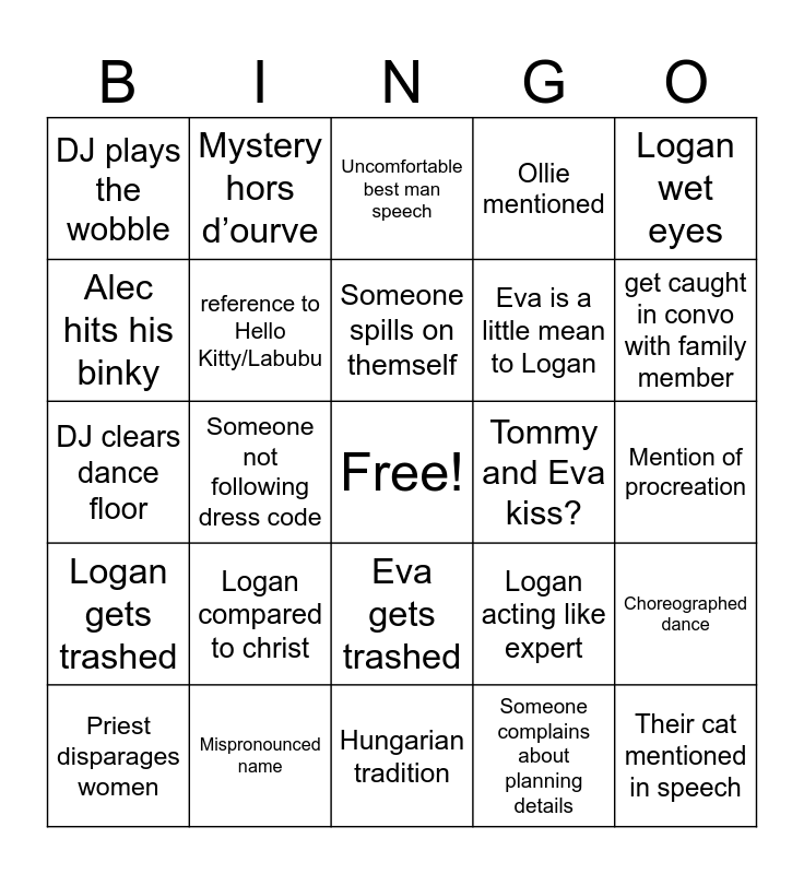 This bingo card has a free space and 24 words: Logan compared to christ, Mispronounced name, Someone spills on themself, Priest disparages women, Logan wet eyes, DJ plays the wobble, Alec hits his binky, Mystery hors d’ourve, Tommy and Eva kiss?, Eva gets trashed, Eva is a little mean to Logan, DJ clears dance floor, Logan acting like expert, Choreographed dance, reference to Hello Kitty/Labubu, Someone complains about planning details, Mention of procreation, Uncomfortable best man speech, get caught in convo with family member, Someone not following dress code, Their cat mentioned in speech, Logan gets trashed, Ollie mentioned and Hungarian tradition.