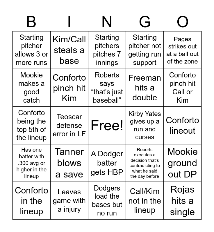 This bingo card has a free space and 26 words: Conforto in the lineup, Leaves game with a injury, Dodgers load the bases but no run, Call/Kim not in the lineup, Conforto pinch hit Call or Kim, Starting pitcher allows 3 or more runs, Kim/Call steals a base, Starting pitchers pitches 7 innings, Freeman hits a double, Mookie ground out DP, Mookie makes a good catch, Tanner blows a save, Roberts executes a decision that’s contradicting to what he said the day before, Rojas hits a single, Conforto being the top 5th of the lineup, Starting pitchers has 5K or more, Roberts says “that’s just baseball”, Kirby Yates gives up a run and curses, Pages strikes out at a ball out of the zone, Has one batter with .300 avg or higher in the lineup, Teoscar defense error in LF, A Dodger batter gets HBP, Starting pitcher not getting run support, Conforto lineout, Conforto pinch hit Kim and Ohtani homers.