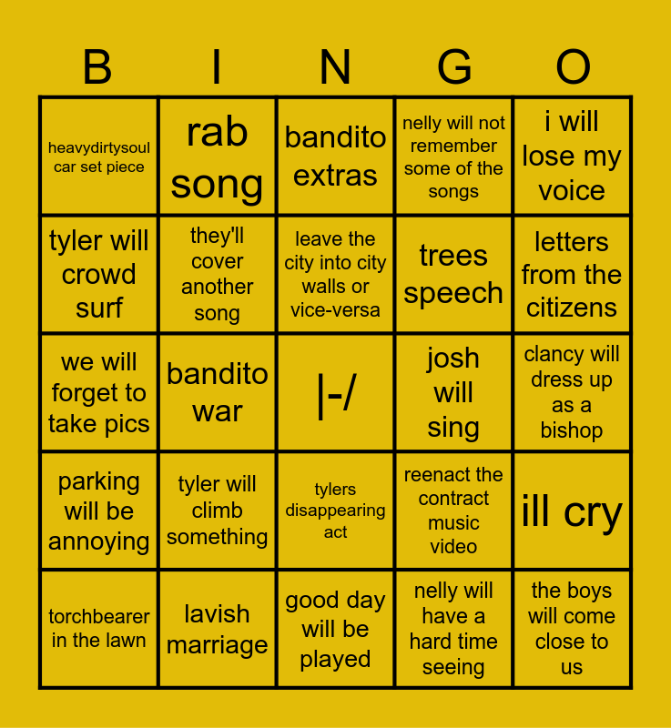 This bingo card has a free space and 24 words: tyler will climb something, lavish marriage, leave the city into city walls or vice-versa, torchbearer in the lawn, i will lose my voice, heavydirtysoul car set piece, tyler will crowd surf, rab song, josh will sing, tylers disappearing act, trees speech, we will forget to take pics, reenact the contract music video, ill cry, they'll cover another song, nelly will have a hard time seeing, clancy will dress up as a bishop, bandito extras, letters from the citizens, bandito war, the boys will come close to us, parking will be annoying, nelly will not remember some of the songs and good day will be played.