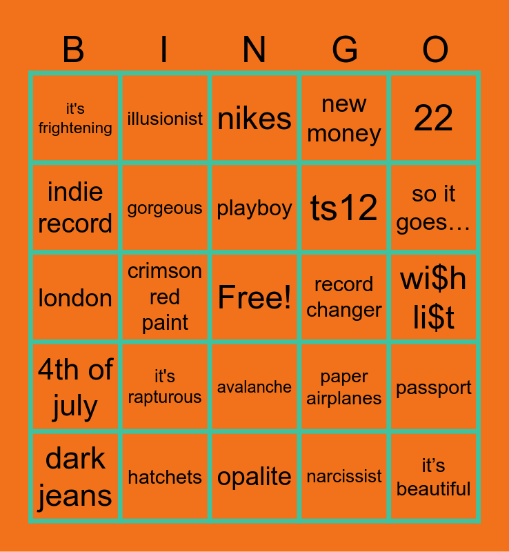 This bingo card has a free space and 120 words: phantom, robber, jailer, richard burton, hipsters, suit and tie, new money, magazine, passport, starbucks lovers, cherry lips, crystal skies, perfect storms, rose garden, invisible locket, sacred oasis, avalanche, east side, dive bar, nightstand, dark jeans, nikes, west side, poison ivy, a-team, 4th of july, hatchets, whisky on ice, sunset and vine, ocean blue eyes, narcissist, crimson red paint, playboy, witches, receipts, headlights, crooked love, american queen, motown beat, kingdom, expensive cars, range rovers, jaguars, plastic cups, scarlet letters, mascara, national anthem, record changer, polaroid, screaming color, last december, necklace, paper airplanes, twenty stiches, hospital room, monsters, his new girlfriend, magician, gold cage, illusionist, james dean, red lips, long hair, slicked back, white t-shirt, tight little skirt, indie record, nice dress, rosy cheeks, rabbit hole, cheshire cat smile, london, red, 1989, reputation, orange, feathers, ts12, sweat and vanilla perfume, it’s beautiful, it's rapturous, it's frightening, shiny bug, baby, that's show business, tiny bubbles in champagne, the fate of ophelia, elizabeth taylor, opalite, father figure, eldest daughter, ruin the friendship, actually romantic, wi$h li$t, wood, cancelled!, honey, the life of a showgirl (feat. sabrina carpenter), …ready for it?, 22, all you had to do was stay, bad blood, blank space, dancing with our hands tied, delicate, don’t blame me, end game, gorgeous, how you get the girl, i did something bad, i knew you were trouble, i wish you would, king of my heart, new romantics, out of the woods, shake it off, so it goes…, style, we are never ever getting back together, wildest dreams, wonderland and message in a bottle.