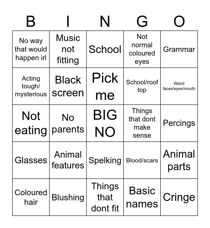 This bingo card has a free space and 24 words: Animal features, Blushing, Pick me, Coloured hair, Grammar, No way that would happen irl, Acting tough/ mysterious, Music not fitting, Things that dont make sense, Spelking, School/roof top, Not eating, Blood/scars, Animal parts, Black screen, Basic names, Percings, School, Weird faces/eyes/mouth, No parents, Cringe, Glasses, Not normal coloured eyes and Things that dont fit.