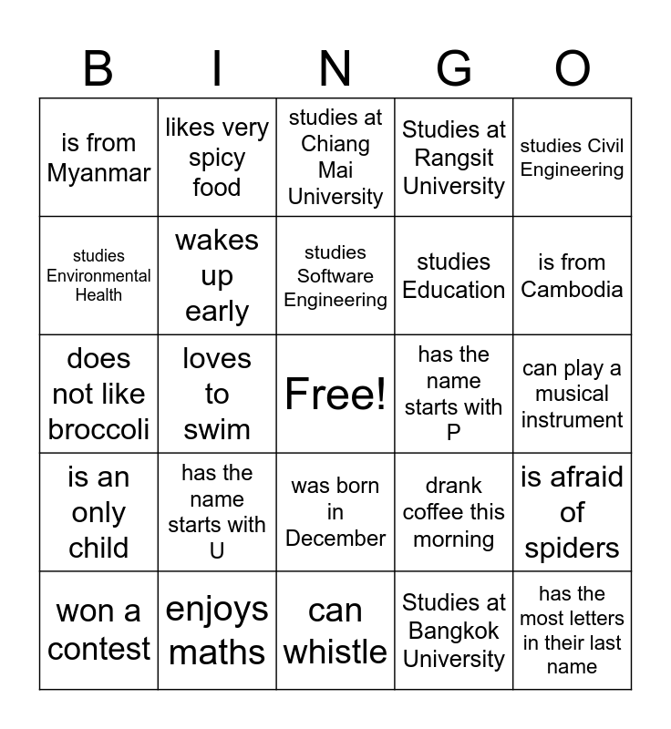 This bingo card has a free space and 24 words: has the name starts with U, enjoys maths, studies Software Engineering, won a contest, studies Civil Engineering, is from Myanmar, studies Environmental Health, likes very spicy food, has the name starts with P, was born in December, studies Education, does not like broccoli, drank coffee this morning, is afraid of spiders, wakes up early, Studies at Bangkok University, can play a musical instrument, studies at Chiang Mai University, is from Cambodia, loves to swim, has the most letters in their last name, is an only child, Studies at Rangsit University and can whistle.
