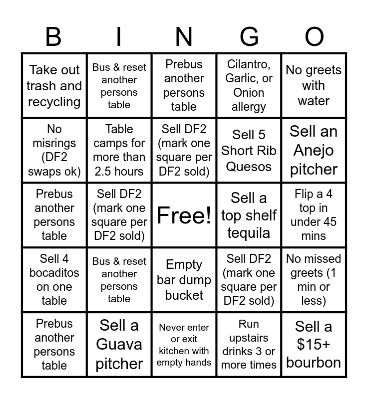 This bingo card has a free space and 24 words: Bus & reset another persons table, Sell a Guava pitcher, Sell DF2 (mark one square per DF2 sold), Prebus another persons table, No greets with water, Take out trash and recycling, No misrings (DF2 swaps ok), Bus & reset another persons table, Sell a top shelf tequila, Empty bar dump bucket, Sell 5 Short Rib Quesos, Prebus another persons table, Sell DF2 (mark one square per DF2 sold), No missed greets (1 min or less), Table camps for more than 2.5 hours, Run upstairs drinks 3 or more times, Flip a 4 top in under 45 mins, Prebus another persons table, Sell an Anejo pitcher, Sell DF2 (mark one square per DF2 sold), Sell a $15+ bourbon, Sell 4 bocaditos on one table, Cilantro, Garlic, or Onion allergy and Never enter or exit kitchen with empty hands.