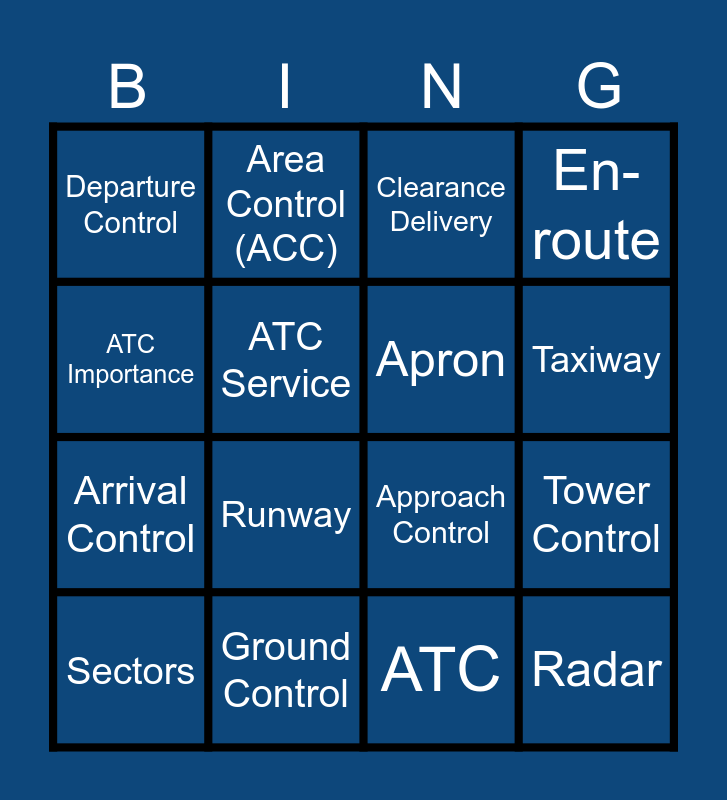This bingo card has 16 words: Ground Control, Tower Control, Clearance Delivery, Departure Control, Arrival Control, Area Control (ACC), Approach Control, ATC, ATC Importance, ATC Service, Sectors, En-route, Runway, Taxiway, Apron and Radar.