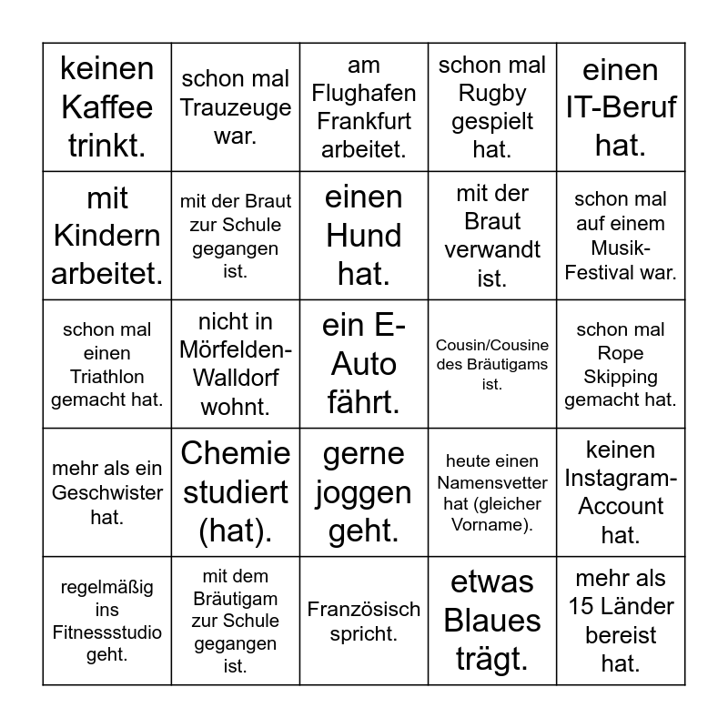 This bingo card has 25 words: Chemie studiert (hat)., Französisch spricht., einen Hund hat., regelmäßig ins Fitnessstudio geht., einen IT-Beruf hat., keinen Kaffee trinkt., mit Kindern arbeitet., schon mal Trauzeuge war., Cousin/Cousine des Bräutigams ist., gerne joggen geht., mit der Braut verwandt ist., schon mal einen Triathlon gemacht hat., heute einen Namensvetter hat (gleicher Vorname)., keinen Instagram-Account hat., mit der Braut zur Schule gegangen ist., mehr als 15 Länder bereist hat., schon mal Rope Skipping gemacht hat., am Flughafen Frankfurt arbeitet., schon mal auf einem Musik-Festival war., nicht in Mörfelden-Walldorf wohnt., ein E-Auto fährt., mit dem Bräutigam zur Schule gegangen ist., mehr als ein Geschwister hat., schon mal Rugby gespielt hat. and etwas Blaues trägt..