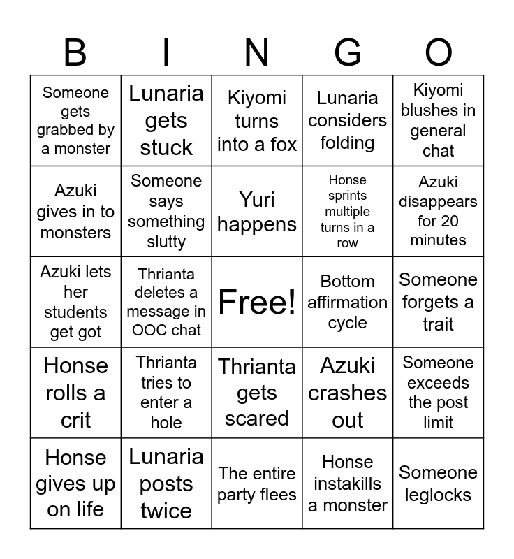 This bingo card has a free space and 24 words: Thrianta tries to enter a hole, Lunaria posts twice, Yuri happens, Honse gives up on life, Kiyomi blushes in general chat, Someone gets grabbed by a monster, Azuki gives in to monsters, Lunaria gets stuck, Bottom affirmation cycle, Thrianta gets scared, Honse sprints multiple turns in a row, Azuki lets her students get got, Azuki crashes out, Someone exceeds the post limit, Someone says something slutty, Honse instakills a monster, Someone forgets a trait, Kiyomi turns into a fox, Azuki disappears for 20 minutes, Thrianta deletes a message in OOC chat, Someone leglocks, Honse rolls a crit, Lunaria considers folding and The entire party flees.