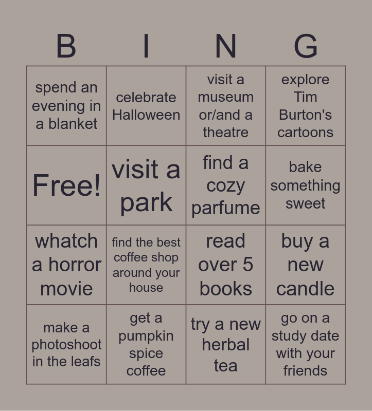 This bingo card has 16 words: get a pumpkin spice coffee, buy a new candle, visit a museum or/and a theatre, spend an evening in a blanket, whatch a horror movie, celebrate Halloween, read over 5 books, try a new herbal tea, Free!, visit a park, make a photoshoot in the leafs, explore Tim Burton's cartoons, find the best coffee shop around your house, bake something sweet, find a cozy parfume and go on a study date with your friends.