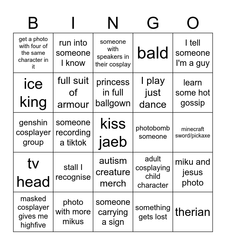 This bingo card has a free space and 24 words: stall I recognise, photo with more mikus, princess in full ballgown, masked cosplayer gives me highfive, I tell someone I'm a guy, get a photo with four of the same character in it, ice king, run into someone I know, photobomb someone, autism creature merch, I play just dance, genshin cosplayer group, adult cosplaying child character, miku and jesus photo, full suit of armour, something gets lost, minecraft sword/pickaxe, someone with speakers in their cosplay, learn some hot gossip, someone recording a tiktok, therian, tv head, bald and someone carrying a sign.