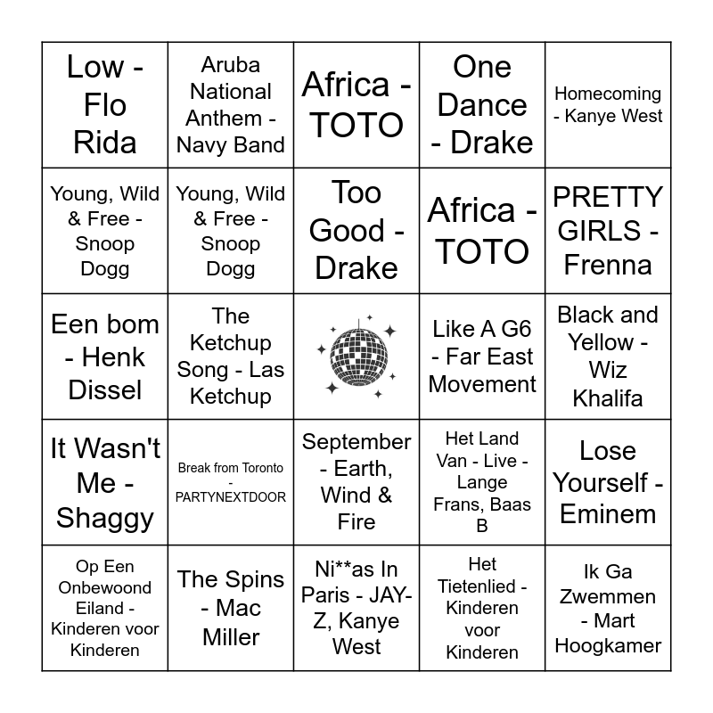This bingo card has a free space and 29 words: Op Een Onbewoond Eiland - Kinderen voor Kinderen, Ademnood - Linda Roos, The Ketchup Song - Las Ketchup, Miss Independent - Ne-Yo, Low - Flo Rida, Africa - TOTO, Young, Wild & Free - Snoop Dogg, Break from Toronto - PARTYNEXTDOOR, Like A G6 - Far East Movement, The Spins - Mac Miller, Black and Yellow - Wiz Khalifa, Ik Ga Zwemmen - Mart Hoogkamer, Ni**as In Paris - JAY-Z, Kanye West, Het Tietenlied - Kinderen voor Kinderen, PRETTY GIRLS - Frenna, Not Like Us - Kendrick Lamar, September - Earth, Wind & Fire, It Wasn't Me - Shaggy, Homecoming - Kanye West, Een bom - Henk Dissel, Het Land Van - Live - Lange Frans, Baas B, Jungle - Broederliefde, Africa - TOTO, Young, Wild & Free - Snoop Dogg, One Dance - Drake, Aruba National Anthem - Navy Band, Lose Yourself - Eminem, Too Good - Drake and Happy Birthday - Stevie Wonder.