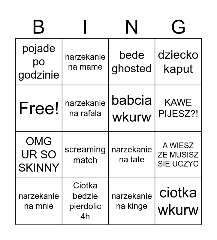 This bingo card has 16 words: Ciotka bedzie pierdolic 4h, A WIESZ ZE MUSISZ SIE UCZYC, bede ghosted, pojade po godzinie, OMG UR SO SKINNY, narzekanie na mame, narzekanie na tate, narzekanie na kinge, Free!, narzekanie na rafala, narzekanie na mnie, dziecko kaput, screaming match, KAWE PIJESZ?!, babcia wkurw and ciotka wkurw.