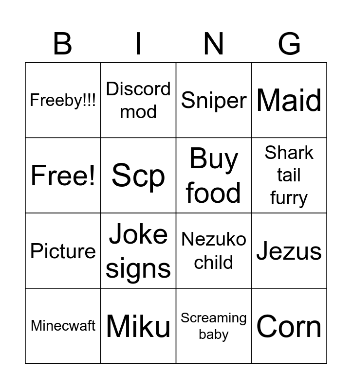 This bingo card has 16 words: Miku, Jezus, Sniper, Freeby!!!, Picture, Discord mod, Nezuko child, Screaming baby, Free!, Scp, Minecwaft, Maid, Joke signs, Shark tail furry, Buy food and Corn.