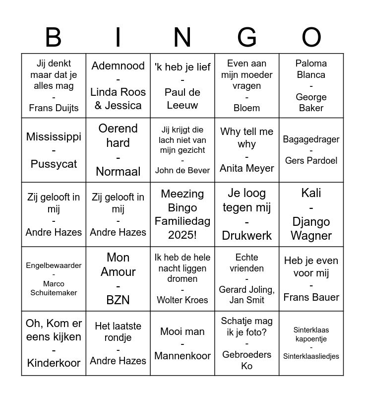 This bingo card has a free space and 65 words: Brabant - Guus Meeuwis, Bestel Mar - Rowwen Hèze, Huisje op wielen - Frank van Etten, Heb je even voor mij - Frans Bauer, Dancing Queen - ABBA, Mexico - Zangeres zonder naam, Ademnood - Linda Roos & Jessica, Atemlos Dutch die nacht - Hélène Fischer, Jij krijgt die lach niet van mijn gezicht - John de Bever, Sinds 1 dag of 2 - Doe Maar, Ik heb de hele nacht liggen dromen - Wolter Kroes, Boys - Dolly Dots, Kali - Django Wagner, Paloma Blanca - George Baker, Sexbom - Tom Jones, Mississippi - Pussycat, Zij gelooft in mij - Andre Hazes, Jij denkt maar dat je alles mag - Frans Duijts, Your the one that I want John Travolta, Why tell me why - Anita Meyer, Mon Amour - BZN, Engelbewaarder - Marco Schuitemaker, Even aan mijn moeder vragen - Bloem, Rosanne - Nick en Simon, Mooie blauwe ogen - Django Wagner, Terug in de tijd - Yves Berendse, 'T dondert en 't bliksemt - Guus meeuwis, Limburg - Rowwen Héze, Sinterklaas kapoentje - Sinterklaasliedjes, Zie ginds komt de stoomboot - Kinderkoor, Oh, Kom er eens kijken - Kinderkoor, Zwarte piet ging uit fietsen - Sinterklaasliedjes, Hoort wie klopt daar kinderen - Kinderkoor, Ik ben blij dat ik je niet vergeten ben - Guus Meeuwis, Echte vrienden - Gerard Joling, Jan Smit, Het laatste rondje - Andre Hazes, Een beetje verliefd - Andre Hazes, Zij gelooft in mij - Andre Hazes, Schatje mag ik je foto? - Gebroeders Ko, Mexico - Zangeres zonder naam, Oerend hard - Normaal, het is altijd lente in de ogen van de tandartsassistente - Peter de Koning, Je loog tegen mij - Drukwerk, Ik verscheurde je foto - Koos Alberts, Suzanne - V.O.F. De Kunst, Als je lacht - Jan Smit, Bagagedrager - Gers Pardoel, Daar gaat ze - Clouseau, Alles kan een mens gelukkig maken - Rene Froger, Ik kan het niet alleen - De Dijk, Frans Duits - Donnie, Frans Duijts, Ik ga zwemmen - Mart Hoogkamer, Alles is liefde - Blof, Mooi man - Mannenkoor, Belle Héléne - Doe Maar, Als de zon schijnt - André van Duin, Opzij - Herman van Veen, 'k heb je lief - Paul de Leeuw, 15 miljoen mensen - Fluitsma & van Tijn, Foxie foxtrot - Nico Haak, Smurfenlied - Vader Abraham, In d'n hiemel - Beppie Kraft, Het bananenlied - De Boswachters, Kon ik maar even bij je zijn - Gordon and Jij bent zo - Jeroen van der Boom.