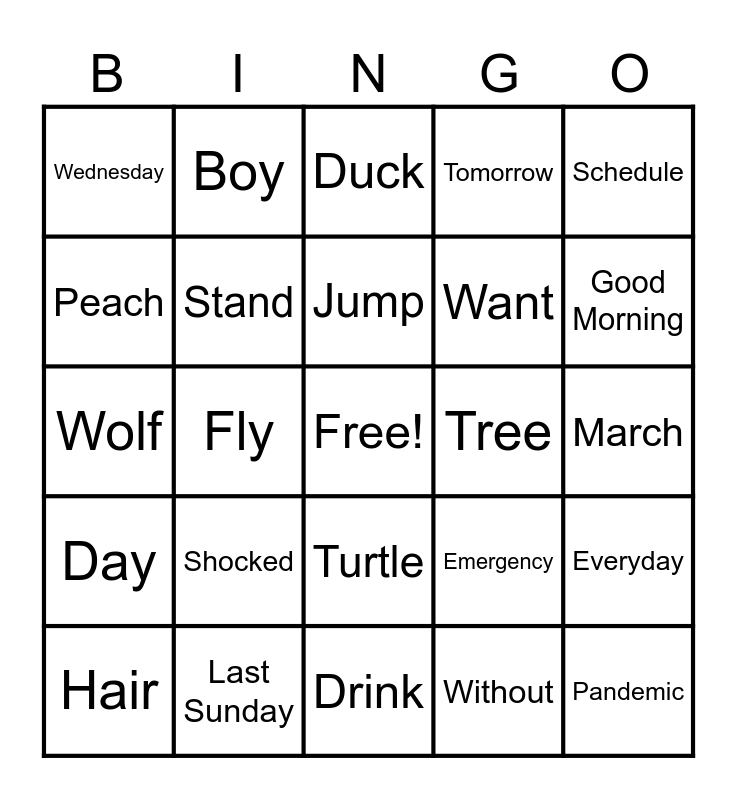 This bingo card has a free space and 299 words: Apple, Banana, Peach, Orange, Cherry, Grapes, Water, Lemon, Fruit, Pineapple, Strawberry, Coconut, Melon, Pear, Watermelon, Eat, Run, Walk, Go, Read, Learn, Want, Like, Take, Give, Work, Help, Drink, Feel, Above, Under, With, Without, Outside, Inside, From, On, Off, After, Before, For, Glasses, Table, Chair, House, School, Tree, Car, Glasses, Plate, Backpack, Money, Book, Happy, Sad, Mad, Angry, Shocked, Scared, Tired, Excited, Smile, Worry, Disappointed, Good, Bad, Bitter, Sweet, Old, Young, Big, Small, Handsome, Ugly, Fast, Slow, Grumpy, Beautiful, Dog, Cat, Turtle, Rabbit, Mouse, Cow, Duck, Pig, Sheep, Fish, Chicken, Horse, Good Morning, Good Afternoon, Good Evening, Good Night, Hello, Goodbye, Fine, Thank you, Animal, Crocodile, Giraffe, Bat, Lion, Monkey, Elephant, Bird, Bee, Owl, Eagle, Fox, Wolf, Pet, Monday, Tuesday, Wednesday, Thursday, Friday, Saturday, Sunday, Today, Tomorrow, Yesterday, Everyday, Day, Week, Weekday, Weekend, Monday to Friday, Last Sunday, January, February, March, April, May, June, July, August, September, October, November, December, Month, Year, Next Month, Birthday, Now, Vegetable, Lettuce/Cabbage, Corn, Garlic, Ginger, Pumpkin, Turnip, Tomato, Onion, Potato, Carrot, Peppers, Mushroom, Broccoli, Cucumber, Black, White, Red, Yellow, Blue, Color, Green, Orange, Gray, Brown, Purple, Pink, Family, Kid, Mother, Father, Boy, Girl, Brother, Sister, Grandmother, Grandfather, Daughter, Son, Woman, Man, Daughter, Son, Cousin (F), Cousin (M), Sister, Brother, Aunt, Uncle, Boy, Girl, What, Who, Which, Where, Why, For what, When, How, How many, Meal, Breakfast, Lunch, Dinner, Dessert, Meat, Bacon, Beef, Sausage, Egg, Nut, Bean, Cheese, Burger, Cookie, Ice Cream, Candy, Jump, Stand, Have to, Fly, Sleep, Have, Wake Up, Wash, Cry, Pick Up, Love, Open, Close, Stop, Read, Run, Some, Several, None, Few, Many, Lot/Much, Face, Eyes, Nose, Hair, Body, Head, Back, Hands, Mouth, Teeth, Wash, Stomach, Ear, Leg, Foot/Feet, Cold (disease), Cough, Allergy/Allergic, Breathe, Ambulance, Emergency, Hurt, Call 9-1-1, Blood/Bleed, Cut (injury), Band Aid, Stomachache, Anxiety, Depression, Chicken pox, Diarrhea, Pandemic, Vaccine, Bandage, Math, Biology, History, Language, Classroom, Class, Subject, Schedule, Student, Study, Teacher, Homework, Lot/Much, Read, Write, Paper, Exam/Test, Minus, Plus and Computer.