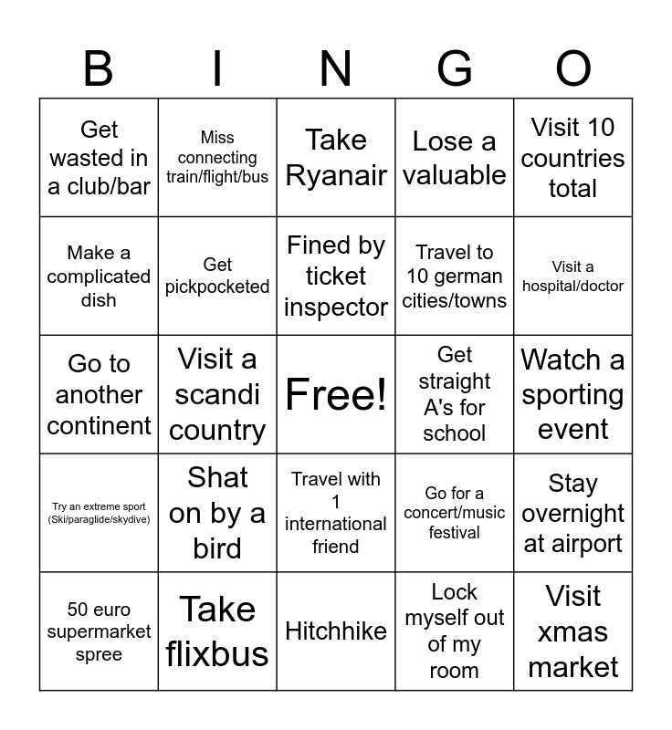 This bingo card has a free space and 24 words: Shat on by a bird, Take flixbus, Fined by ticket inspector, 50 euro supermarket spree, Visit 10 countries total, Get wasted in a club/bar, Make a complicated dish, Miss connecting train/flight/bus, Get straight A's for school, Travel with 1 international friend, Travel to 10 german cities/towns, Go to another continent, Go for a concert/music festival, Stay overnight at airport, Get pickpocketed, Lock myself out of my room, Watch a sporting event, Take Ryanair, Visit a hospital/doctor, Visit a scandi country, Visit xmas market, Try an extreme sport (Ski/paraglide/skydive), Lose a valuable and Hitchhike.