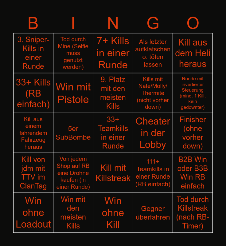 This bingo card has a free space and 24 words: Win ohne Loadout, Von jedem Shop auf RB eine Drohne kaufen (in einer Runde), 9. Platz mit den meisten Kills, Gegner überfahren, Kill aus dem Heli heraus, 3. Sniper-Kills in einer Runde, Tod durch Mine (Selfie muss genutzt werden), 7+ Kills in einer Runde, Cheater in der Lobby, Finisher (ohne vorher down), Kill aus einem fahrendem Fahrzeug heraus, Win mit Pistole, 111+ Teamkills in einer Runde (RB einfach), B2B Win oder B3B Win RB einfach, 33+ Kills (RB einfach), Win mit den meisten Kills, Win ohne Kill, Als letzter aufklatschen o. töten lassen, Runde mit invertierter Steuerung (mind. 1 Kill, kein gedownter), Kill von jdm mit TTV im ClanTag, 5er SubBombe, Kill mit Killstreak, Kills mit Nate/Molly/ Thermite (nicht vorher down) and Tod durch Killstreak (nach RB-Timer).