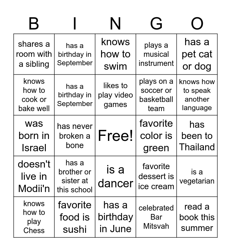 This bingo card has a free space and 24 words: has a brother or sister at this school, favorite food is sushi, likes to play video games, knows how to play Chess, has a pet cat or dog, shares a room with a sibling, knows how to cook or bake well, has a birthday in September, favorite color is green, is a dancer, plays on a soccer or basketball team, was born in Israel, favorite dessert is ice cream, is a vegetarian, has a birthday in September, celebrated Bar Mitsvah, has been to Thailand, knows how to swim, knows how to speak another language, has never broken a bone, read a book this summer, doesn't live in Modii'n, plays a musical instrument and has a birthday in June.