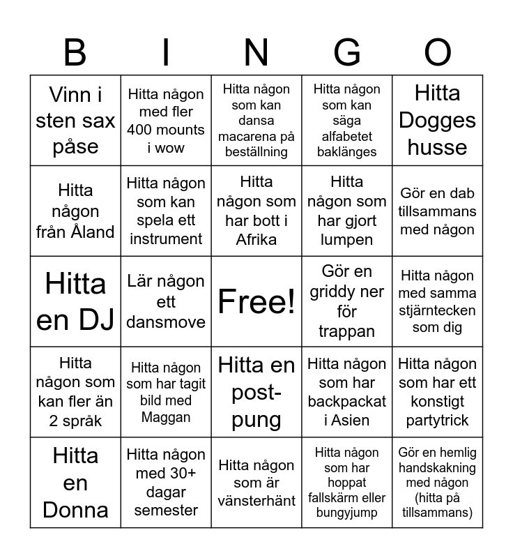 This bingo card has a free space and 24 words: Hitta någon som har tagit bild med Maggan, Hitta någon med 30+ dagar semester, Hitta någon som har bott i Afrika, Hitta en Donna, Hitta Dogges husse, Vinn i sten sax påse, Hitta någon från Åland, Hitta någon med fler 400 mounts i wow, Gör en griddy ner för trappan, Hitta en post-pung, Hitta någon som har gjort lumpen, Hitta en DJ, Hitta någon som har backpackat i Asien, Hitta någon som har ett konstigt partytrick, Hitta någon som kan spela ett instrument, Hitta någon som har hoppat fallskärm eller bungyjump, Hitta någon med samma stjärntecken som dig, Hitta någon som kan dansa macarena på beställning, Gör en dab tillsammans med någon, Lär någon ett dansmove, Gör en hemlig handskakning med någon (hitta på tillsammans), Hitta någon som kan fler än 2 språk, Hitta någon som kan säga alfabetet baklänges and Hitta någon som är vänsterhänt.